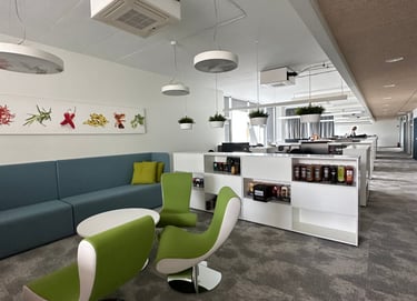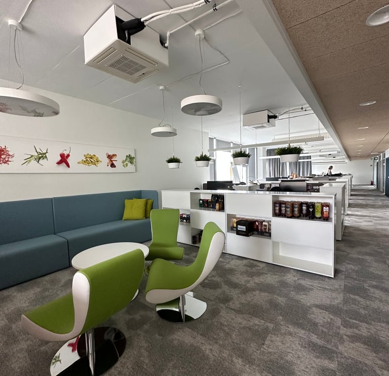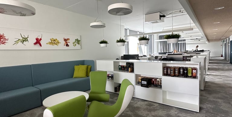 Kiekviename verslo centro aukšte įrengtos atskiros virtuvėlės ir sanitariniai mazgai, patogiam darbuotojų naudojimui.
